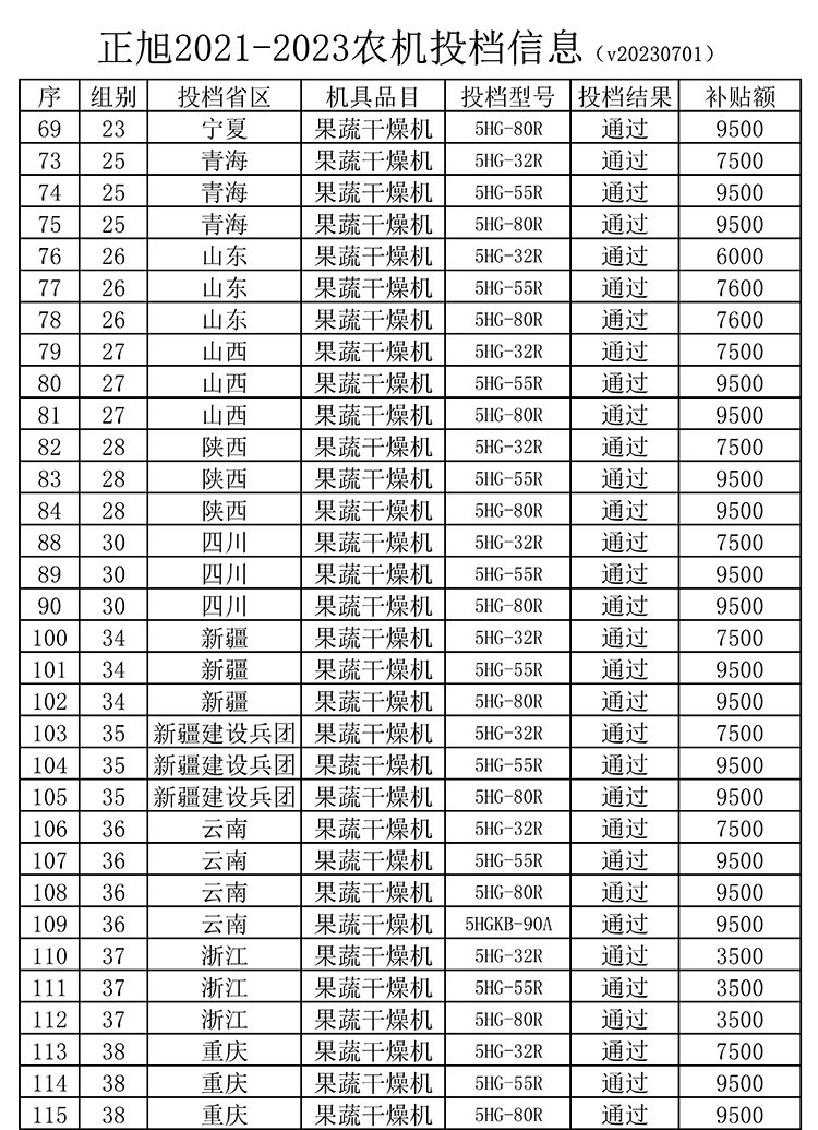 值得一提的是,正旭5HG-32R、5HG-55R、5HG-80R、5HGKB-90A四款果蔬烘干機(jī)成功進(jìn)入安徽、甘肅、廣西、貴州、海南、河北、河南、湖北、吉林、江蘇、江西、遼寧、寧夏、青海、山東、山西、陜西、四川、新疆(含新建建設(shè)兵團(tuán))、云南、浙江、重慶22個(gè)省市自治區(qū)農(nóng)機(jī)補(bǔ)貼目錄,使用正旭熱泵烘干機(jī)最高可享受9500元農(nóng)機(jī)補(bǔ)貼款,這已是正旭連續(xù)多年進(jìn)入各地農(nóng)機(jī)補(bǔ)貼目錄。